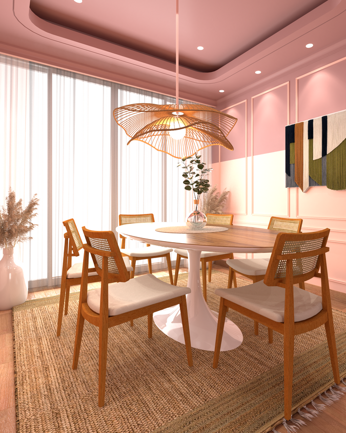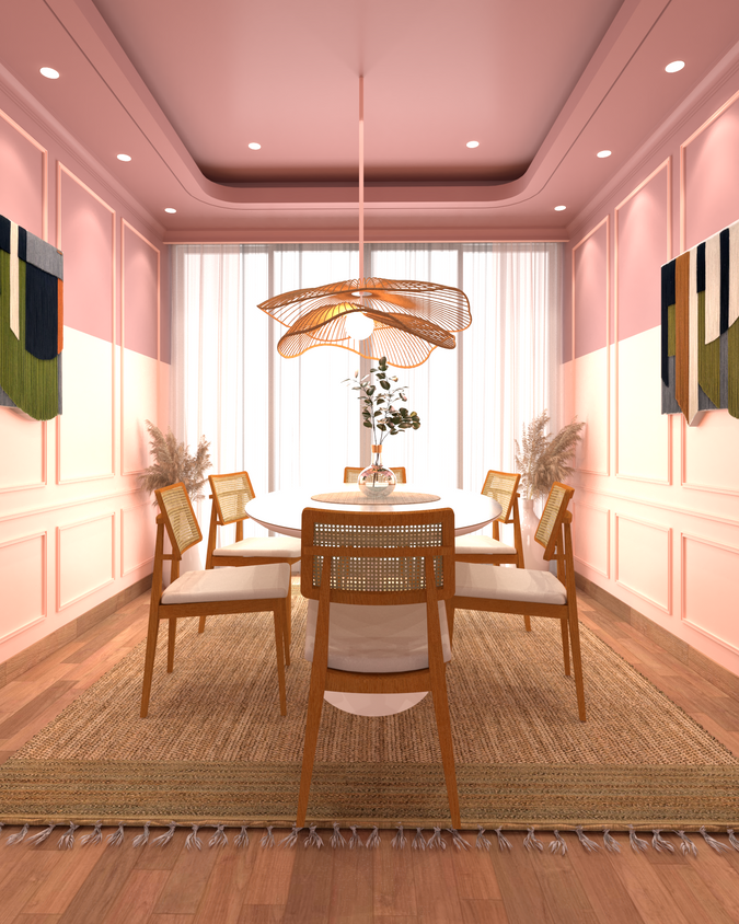 O pé-direito alto permitiu a divisão da parede com tonalidades rosadas marcantes, perfeitas para criar uma atmosfera jovial e muito elegante, contou com elementos despojados e artesanais.